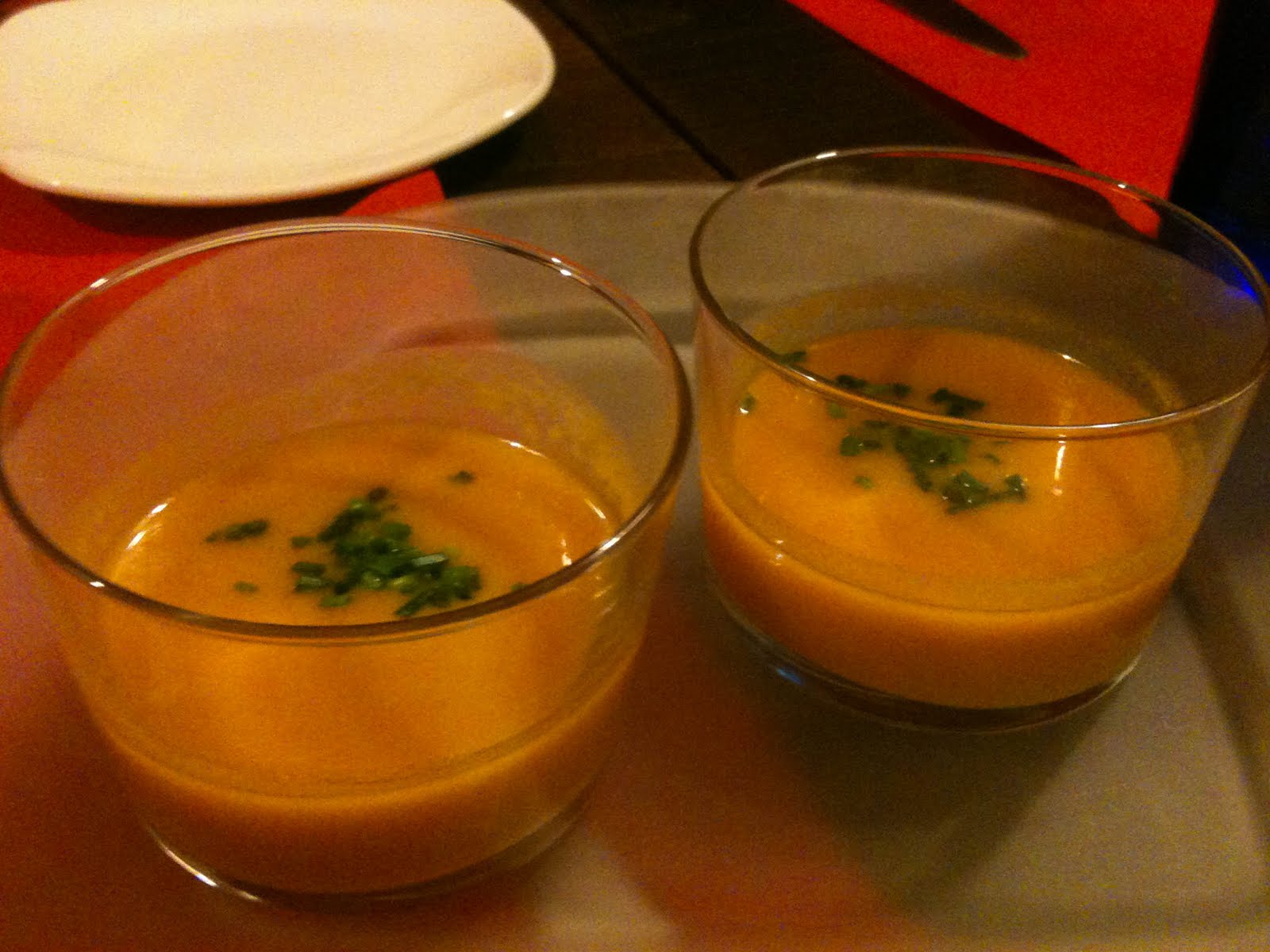 Chipirones rellenos de vieiras sobre crema de patata al azafrán. En este caso, el chipirón estaba duro. Al decilo a la camarera lo intentaron arreglar pero sin mucho acierto.